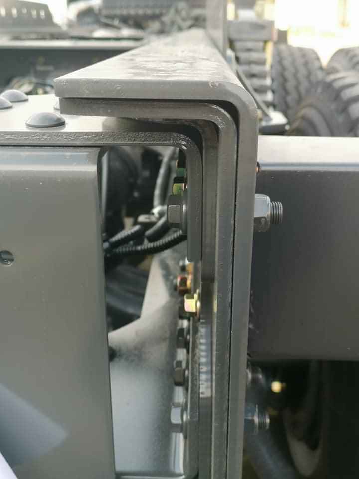 Khung chassi có to bản và được lồng 2 lớp xuyên suốt từ đầu đến cuối, sử dụng công nghệ dập nguội 6.000 tấn đảm bảo sự chắc chắn cho các địa hình phức tạo nhất. Tiết diện 300 (8+8) mm. Tại các đoạn chịu lực được gia cố 3 lớp 8+8+8 nhằm chống hiện tượng vặn xoắn chassi khi thùng xe phải chở lượng hàng rất lớn 50 – 60 tấn.